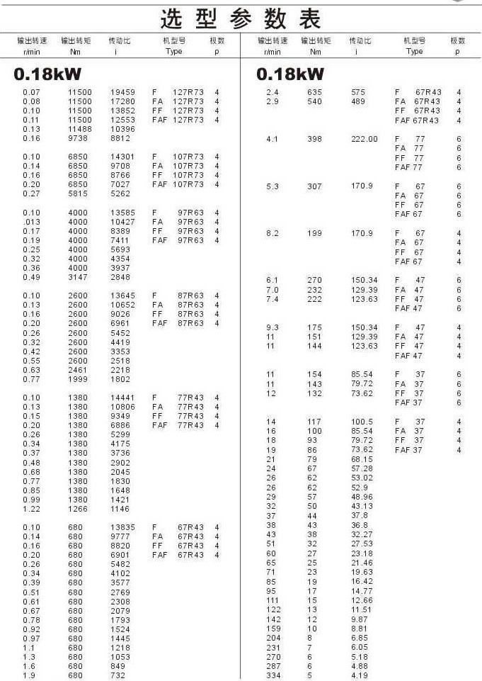 选型参数表0.18kW