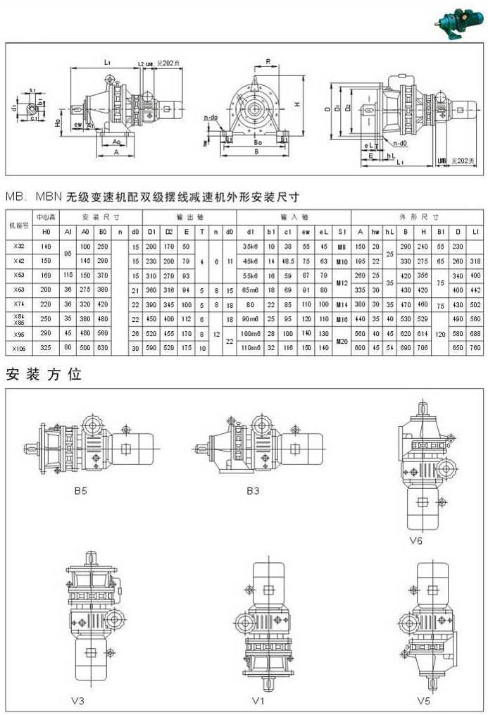 MB.MBN无级变速机配双级摆线减速机外型安装尺寸安装方位