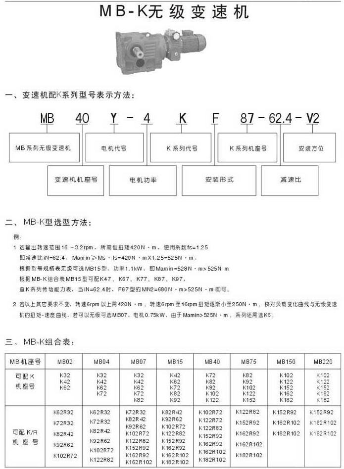 MB-K无级变速机型号表示法选型方法MB-K组合表