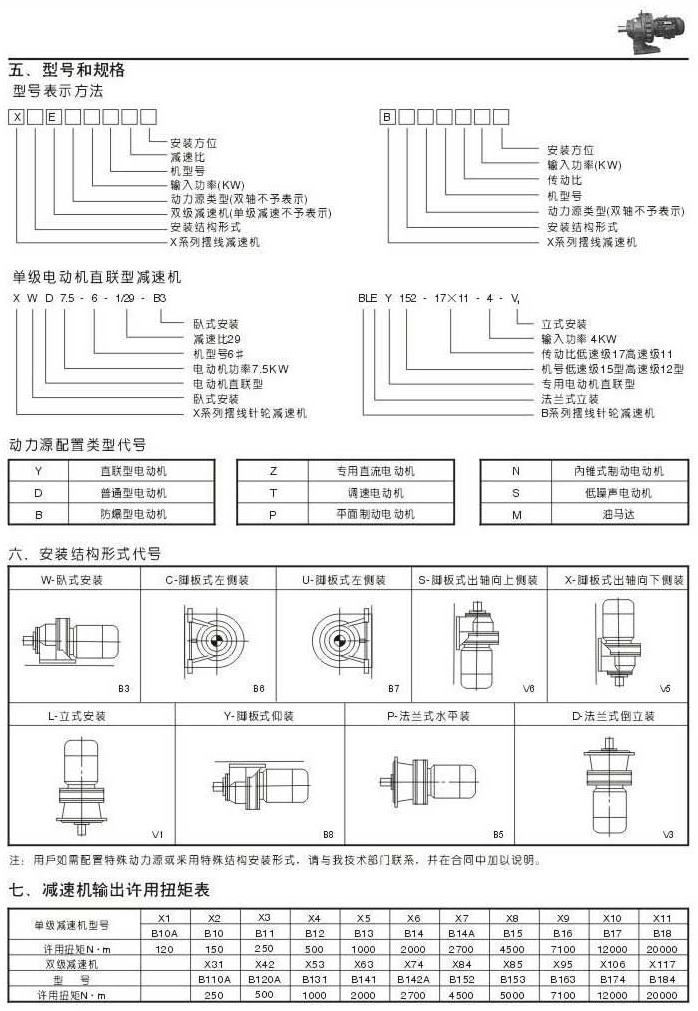 机型号和规格表示法安装结构形式代号减速机输出许用扭矩表