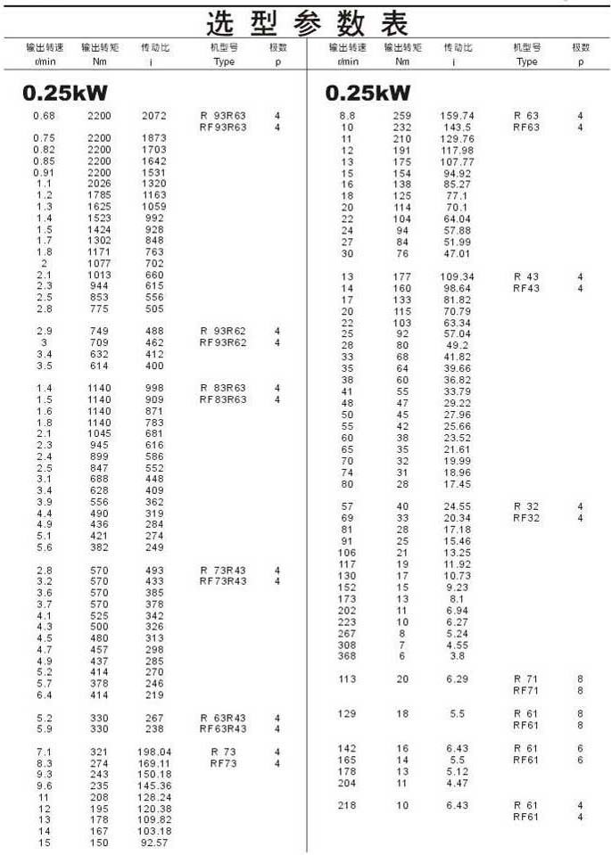 选型参数表0.25kW(续)
